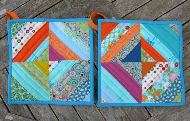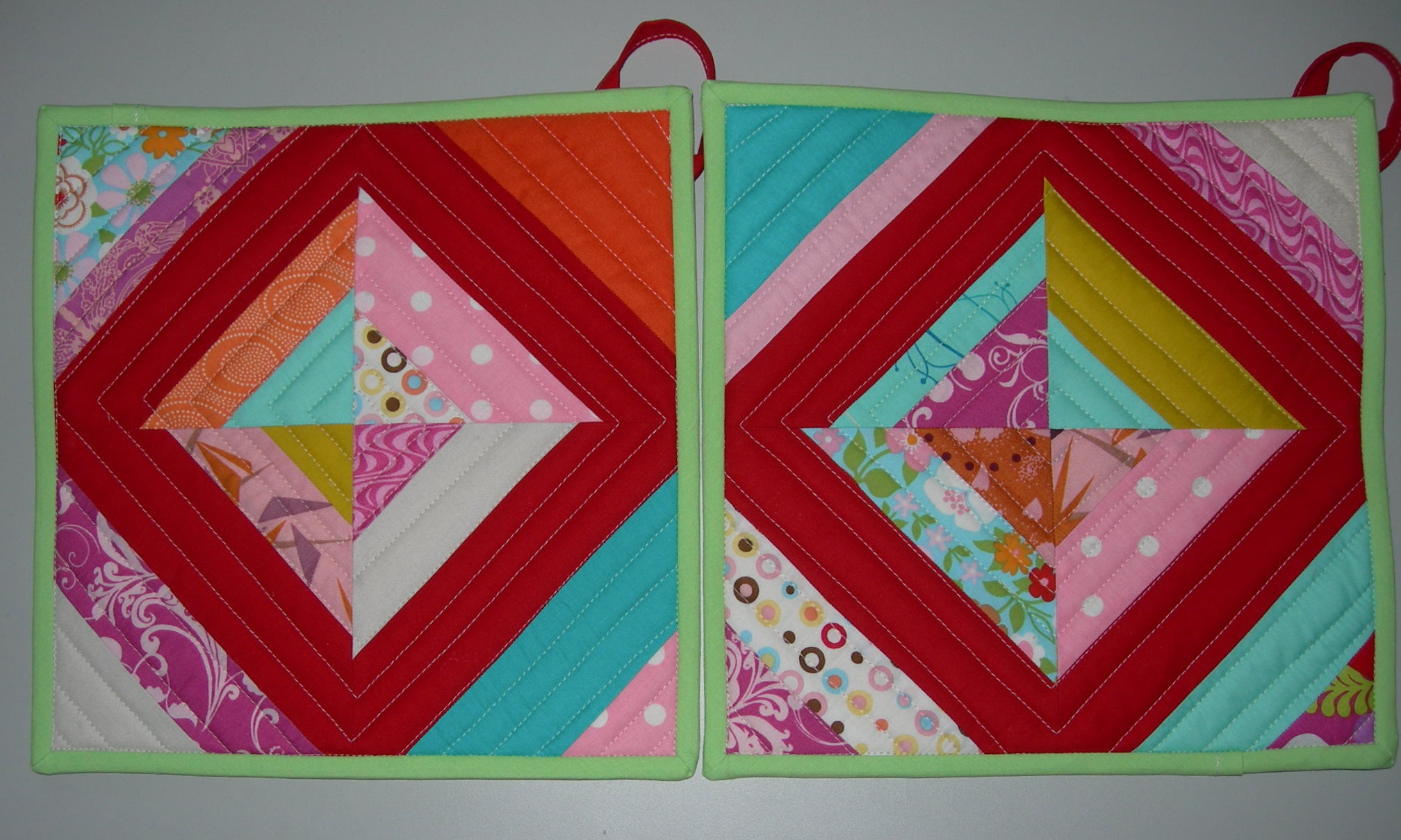 The potholders were inspired by Malka Dubrawsky and here book “fresh*quilting”.