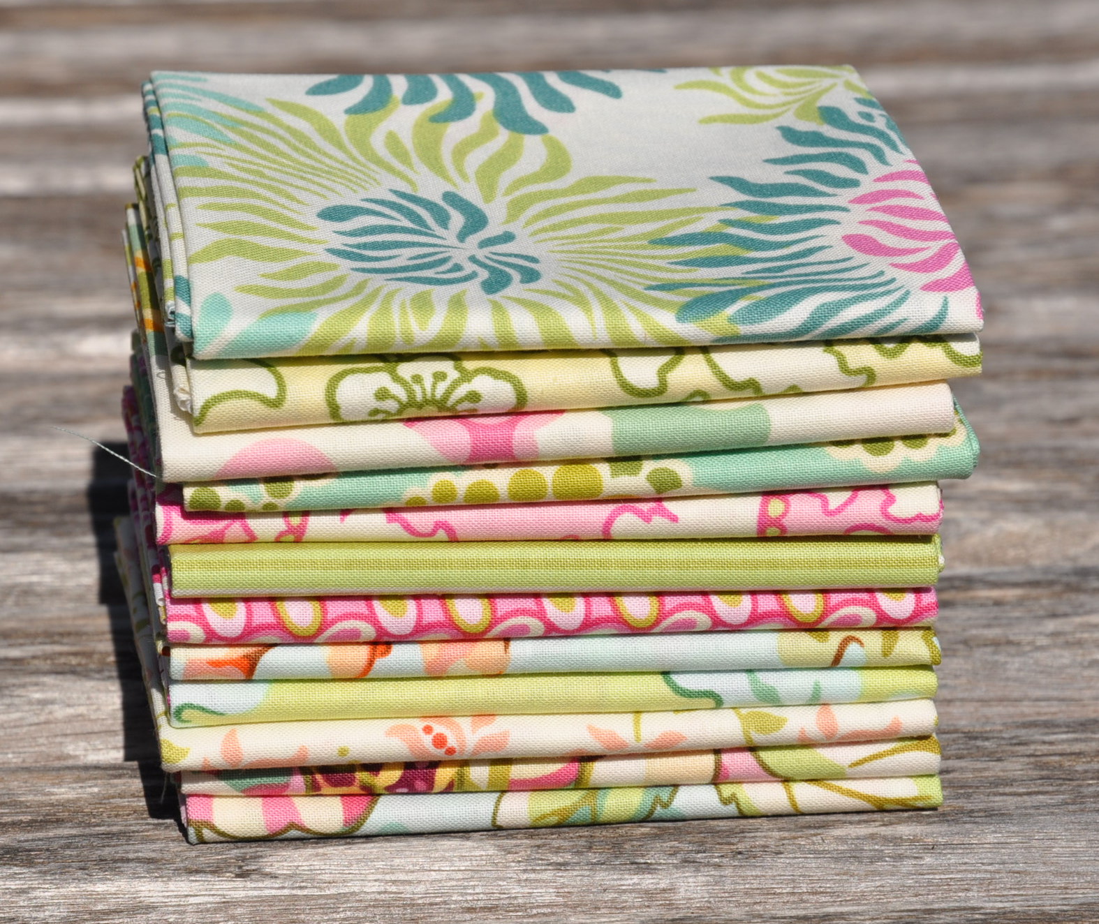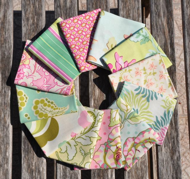 Last friday I finally received a package from the States with all the nice fabrics I ordered. I was especially curious to see the fat quarter bundle from the Freshcut Fabric Collection in Pastel from Heather Bailey. And certainly I did not get disappointed, the greens and pinks are just like a lovely dream. Now I need to finish all the UFOs and start a new quilt.