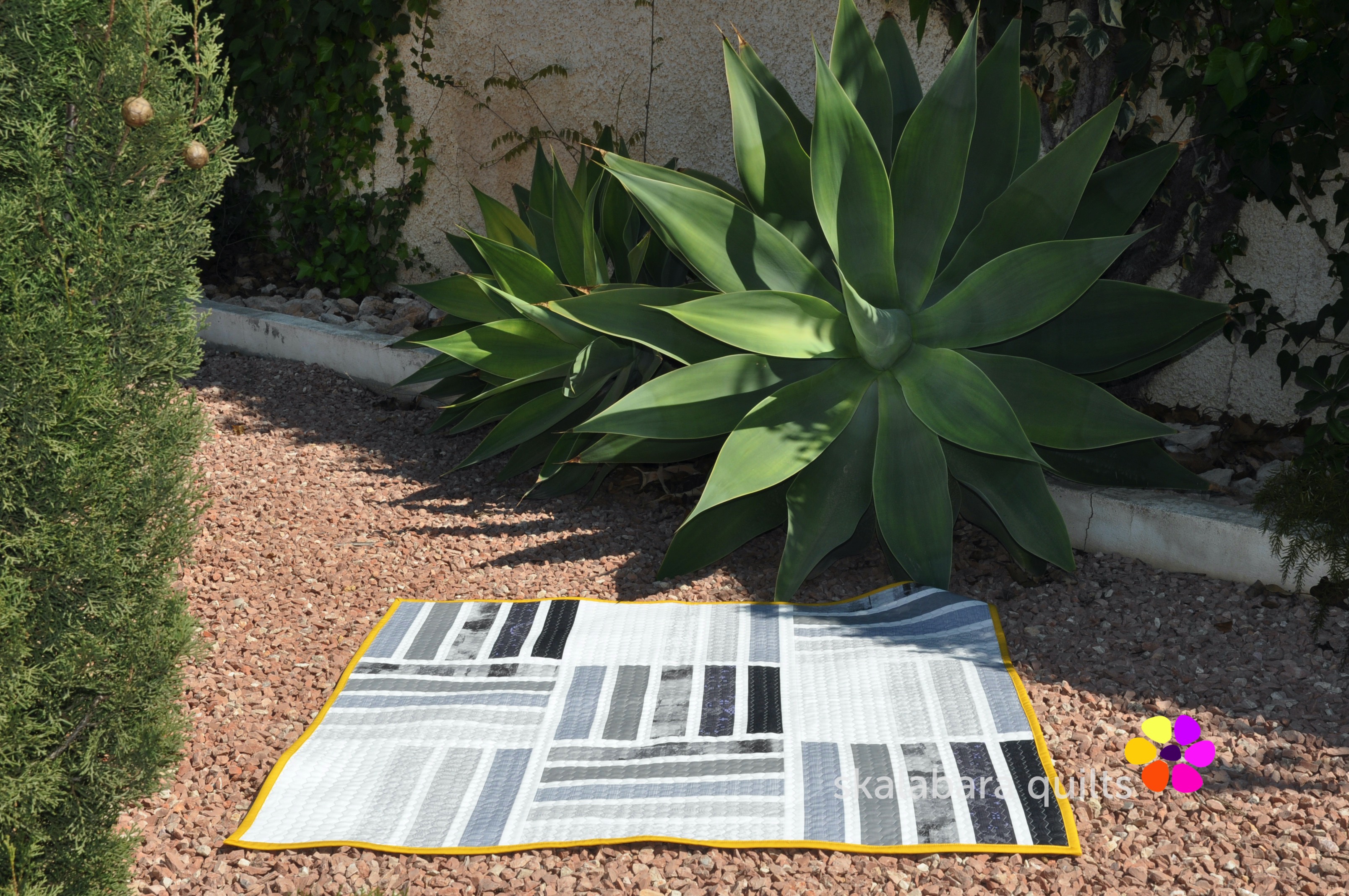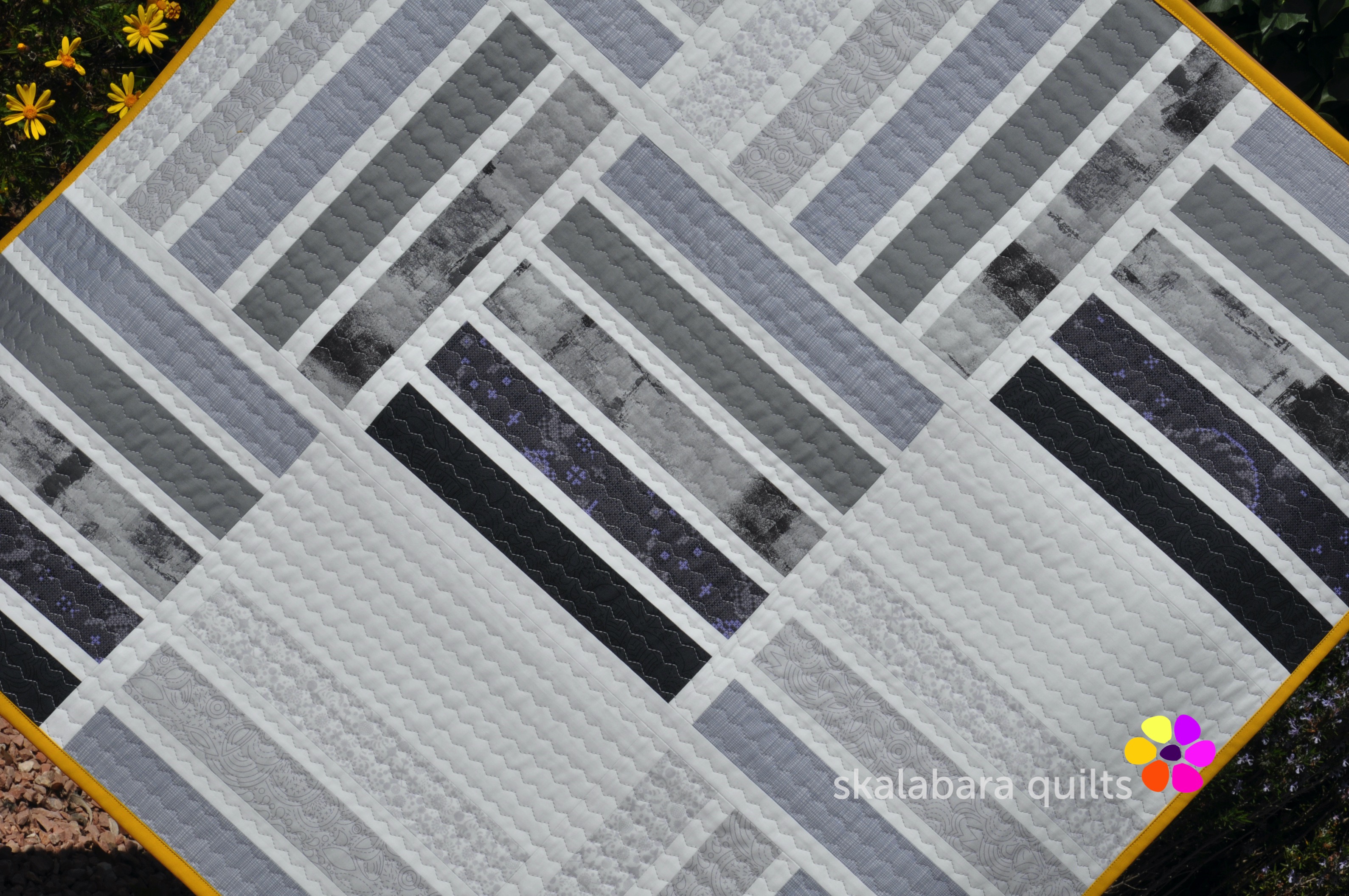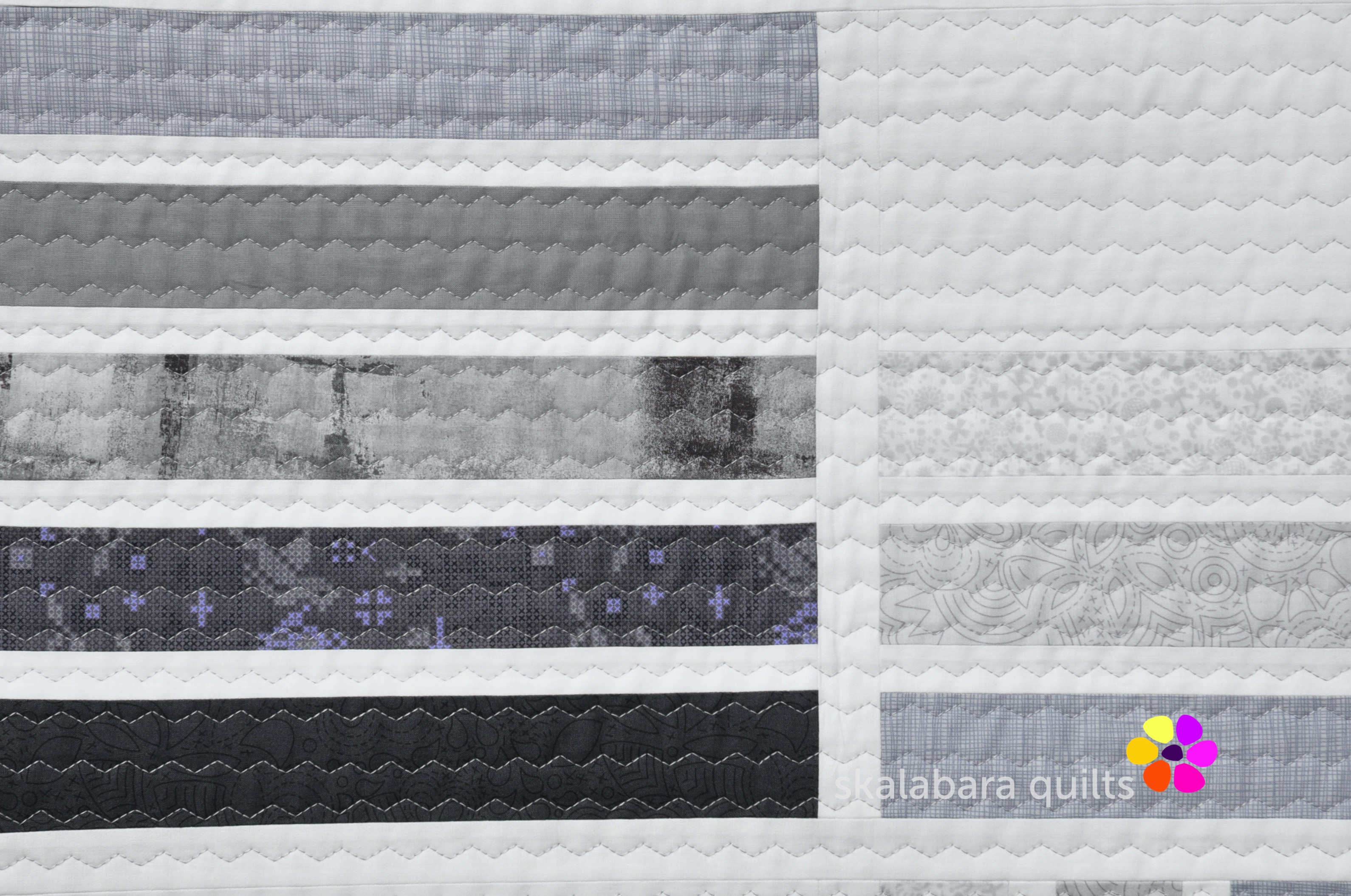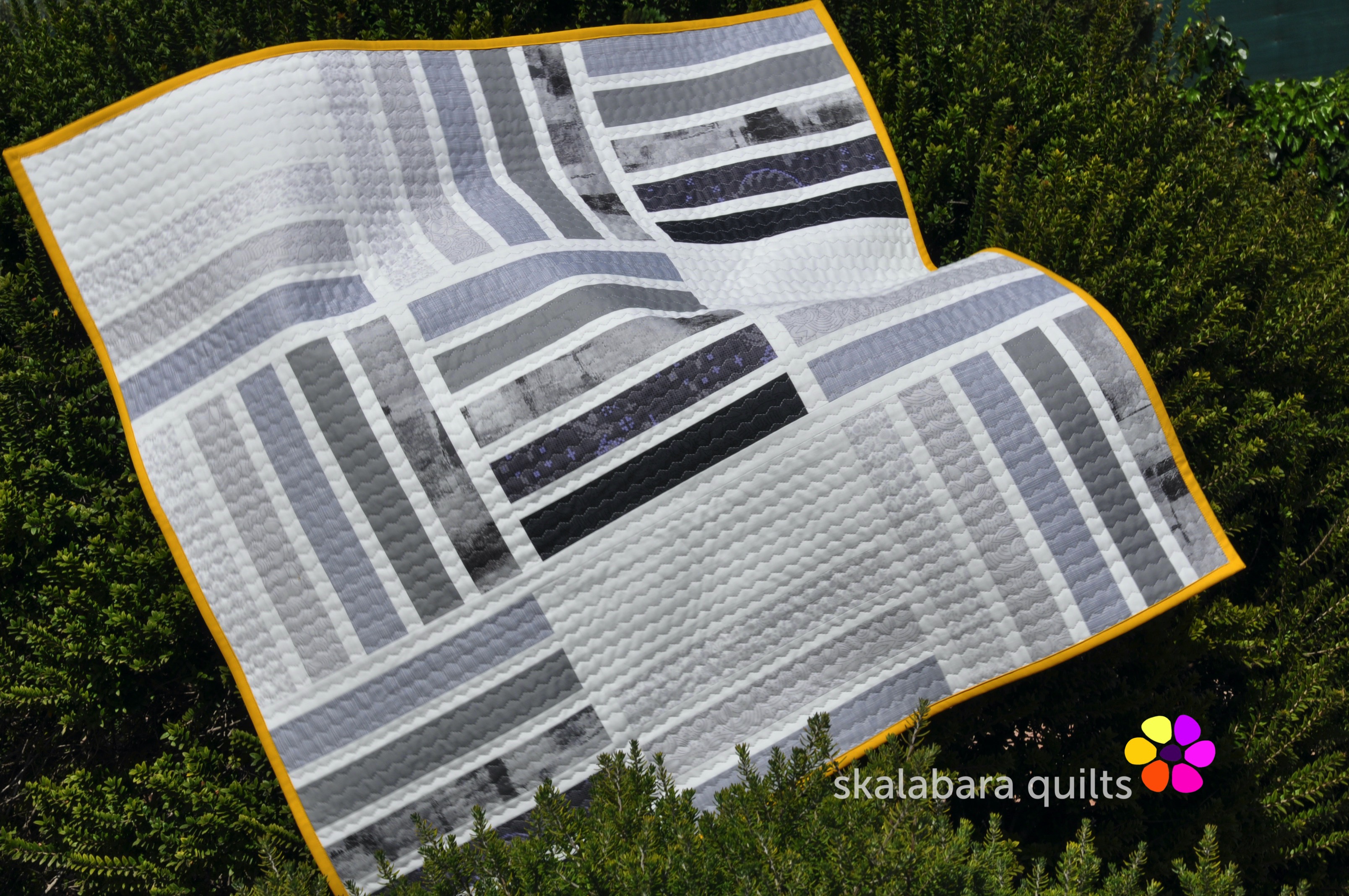 I have been working on a quilt for my Mum, all in turquoise – green – blue hues and I need to make some minor projects in between. This time it is a baby quilt in black – grey – white tones. Pattern is Blakely Quilt by Meghan Buchanan from Then Came June.
