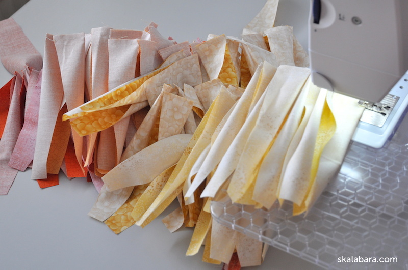 It is exactly a year that I finished the Horizon quilt top. Since then it was waiting on the shelf for further procedure. I had the backing fabrics, but no time to make the sandwich and start quilting. This week I received a bulky parcel from Cottonpatch with a delivery of my favorite wadding : Quilters Dream Cotton Natural Select. So, no more excuses and I started today piecing the backing, got the wadding out of the bag, cleaned the quilt top from loose threads and finally (after a year) made the quilt sandwich.