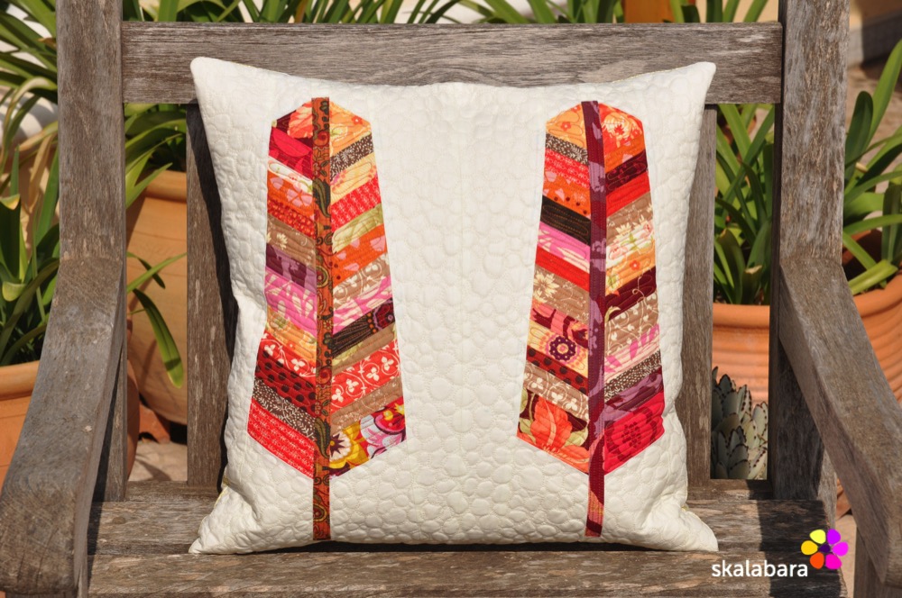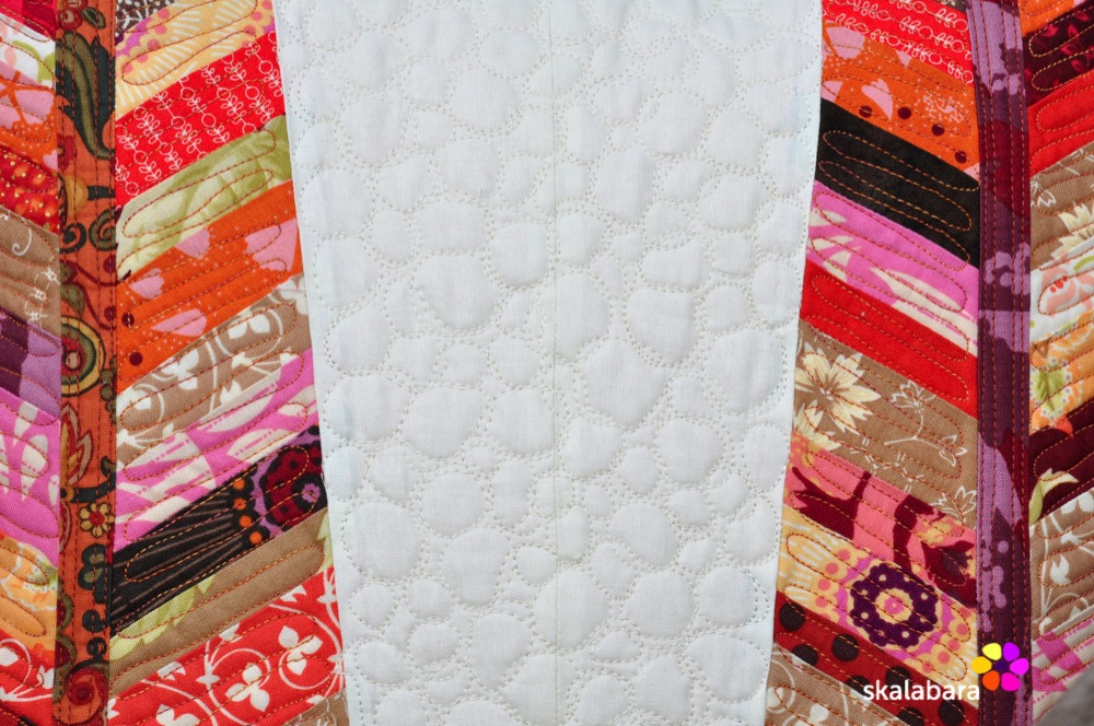The result is a mini quilt measuring 19″ x 19″ with 4 curved log cabin blocks. This block type is ideal for a QAYG (quilt as you go) pattern, but the block should be larger, lets say at least 24″ square. This size is good for a cushion cover or for a throw. I have a few ladies attending my classes that prefer to work on larger, individual blocks and piece them first together when all blocks are quilted. I am starting to be an expert on QAYG patterns. At the moment I am revising my scribbles and feeding the computer with all the QAYG patterns I have written down in my paper notebook.