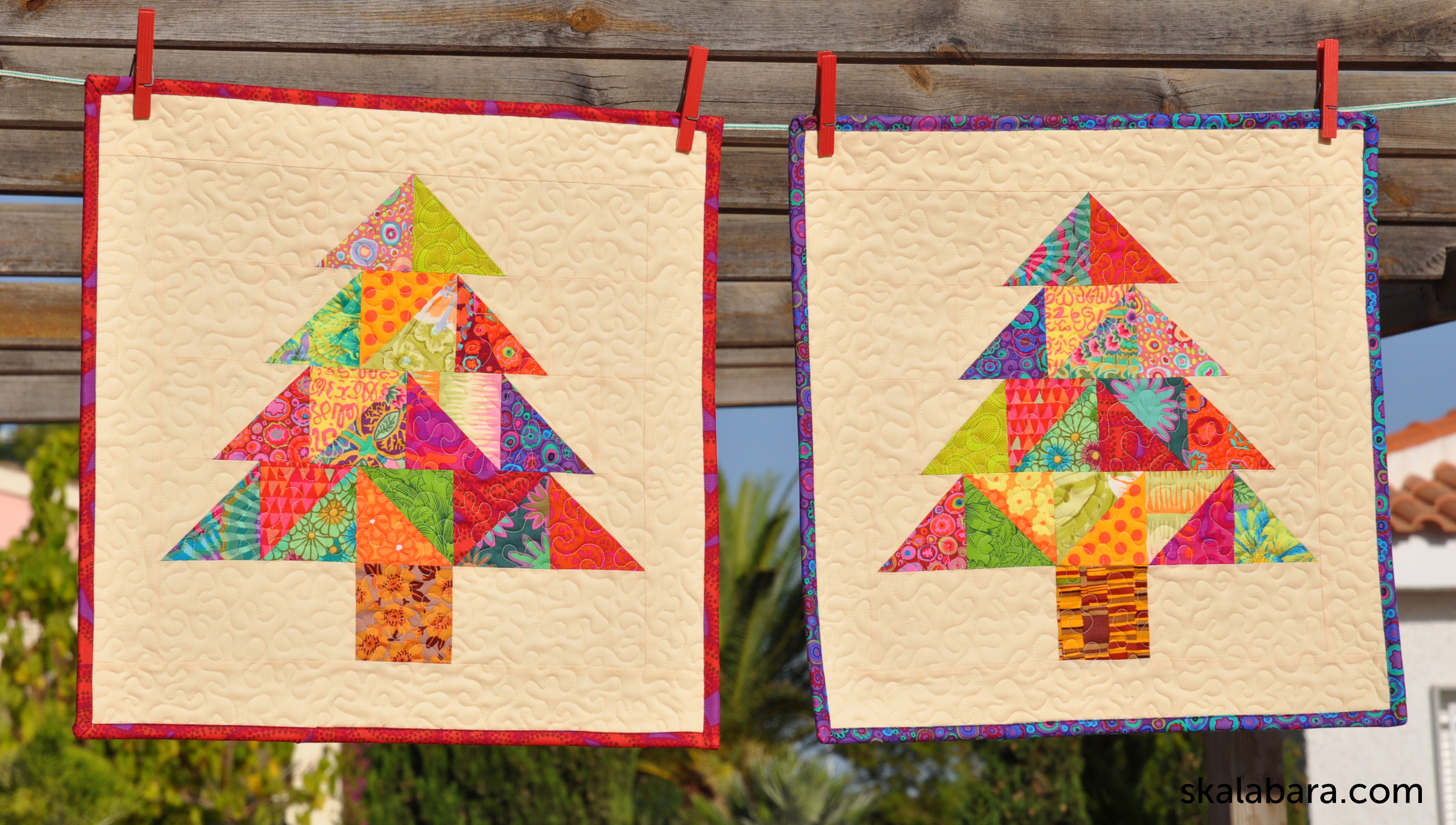 As I am going to Prague this Saturday I was finishing my last pieces that I want to take with me. I made more Christmas Tree Blocks – original design by Christen from Love By Hand. Each block is on its own and makes a nice table decoration or a wall hanging. I have used (as before) Kaffe Fassett fabric designs. Once I had made the quilt sandwich I realized that I do not have any of my “neutral” thicker quilting thread. But I had the exact hue in Aurifil Mako 50/2 as I have pieced the blocks with this thread. I just wasn’t sure if I can take it also for quilting. After some research on the web ( a nicer expression for google ) about threads I decided to stick with this lighter weight thread also for free-motion quilting. According to the motto : learning by doing. Over the years I found out that there are no strict rules in quilting. Each quilter can find its own way, own technique that they prefer, threads that they love. I have also done some experimenting with threads and I always go back to Aurifil Mako 50/2 for piecing and Sulky from Gutermann for quilting.