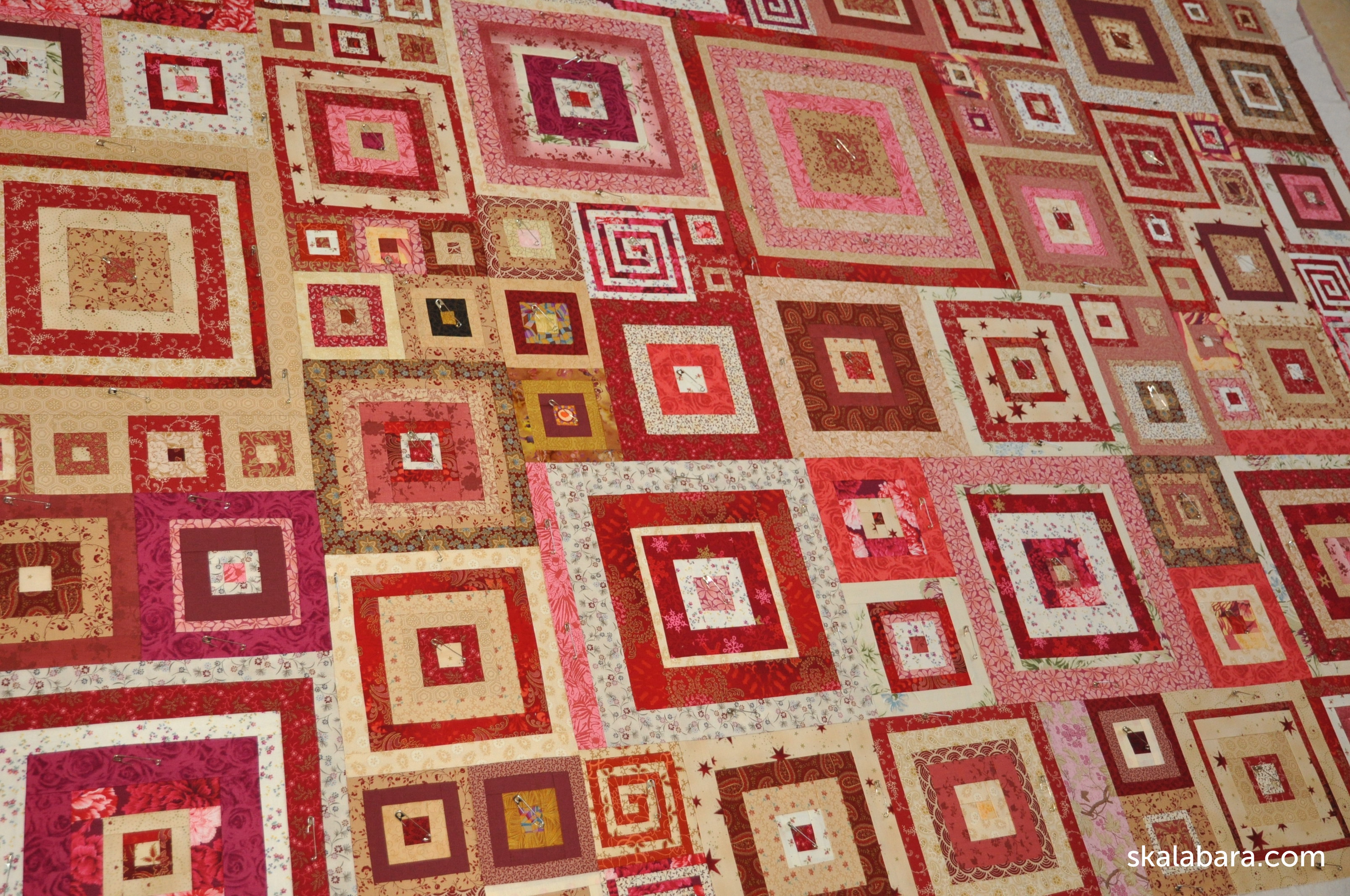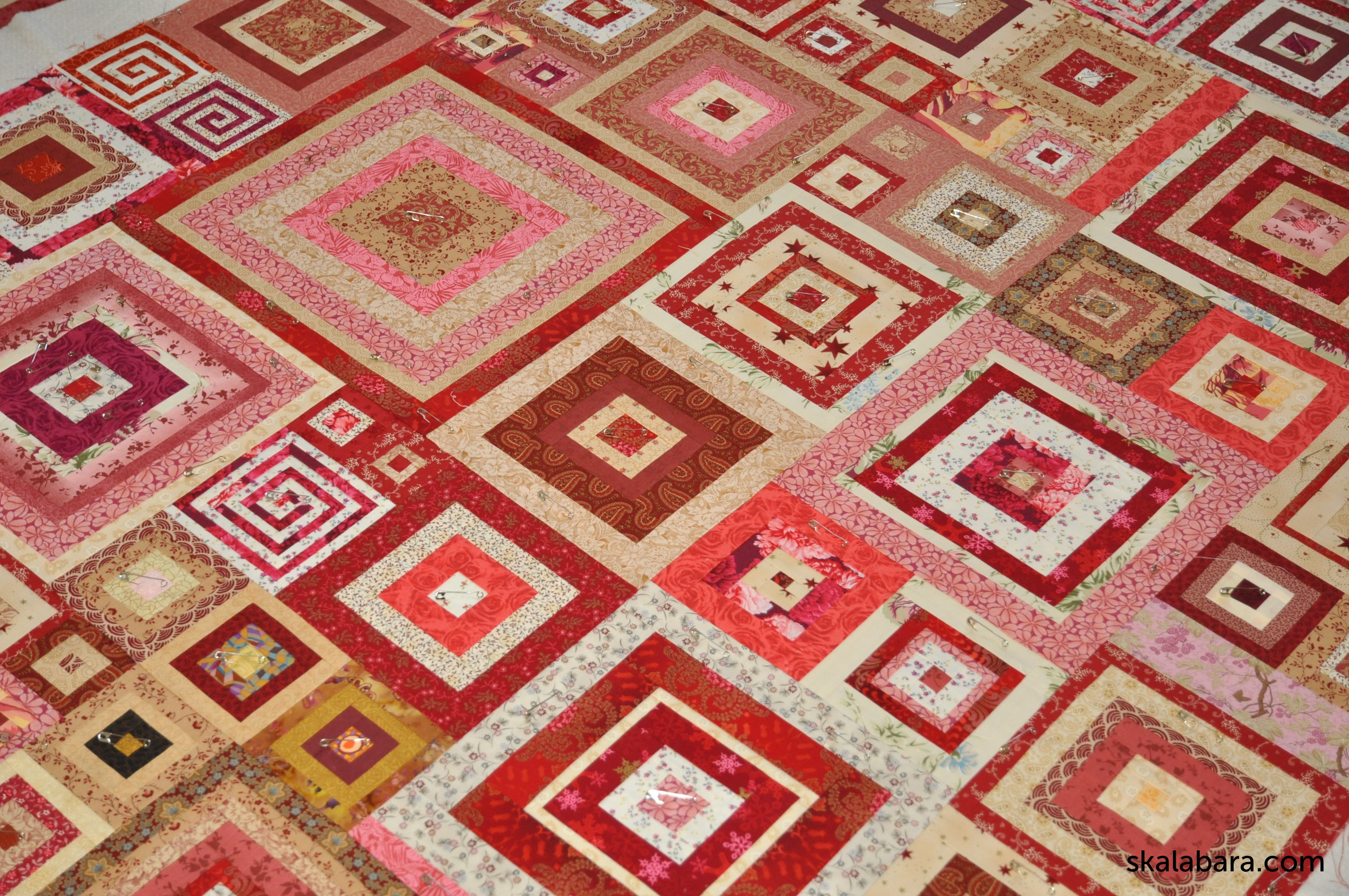 When Joan asked me to a make baby quilt, I remembered the Citrus and Mint Baby Quilt. So I got out my pink fabrics and started. When I made the first layout just with the pinks I thought it would be nice to get in also a touch of yellow. The quilt I made is larger than in the Craftbuds post. I have altogether 80 blocks instead of 42. The quilt is approx. a cot size. I have worked with the same cutting directions : 6,5″ squares as well as 2,5″ squares for the corners, but I used double of the material.