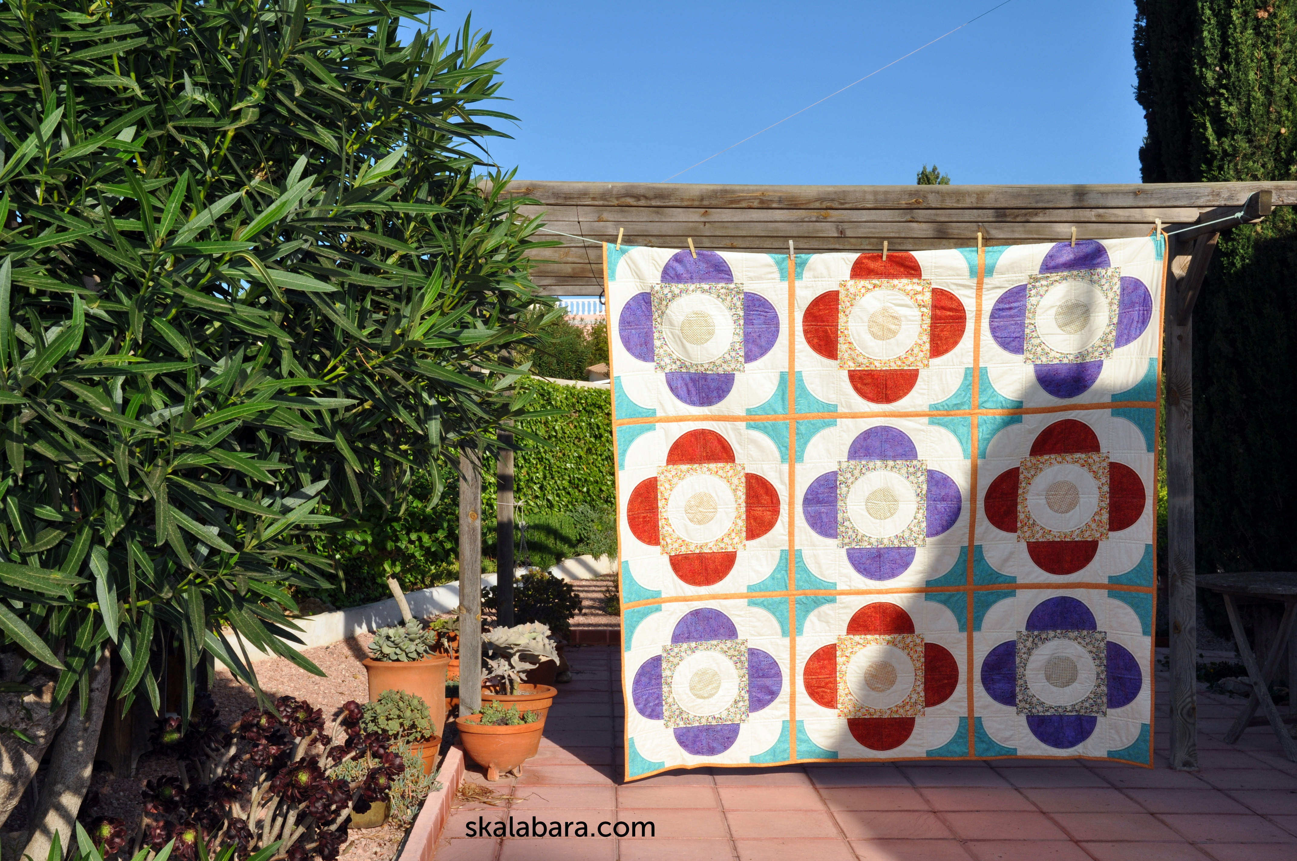 The result is a mini quilt measuring 19″ x 19″ with 4 curved log cabin blocks. This block type is ideal for a QAYG (quilt as you go) pattern, but the block should be larger, lets say at least 24″ square. This size is good for a cushion cover or for a throw. I have a few ladies attending my classes that prefer to work on larger, individual blocks and piece them first together when all blocks are quilted. I am starting to be an expert on QAYG patterns. At the moment I am revising my scribbles and feeding the computer with all the QAYG patterns I have written down in my paper notebook.