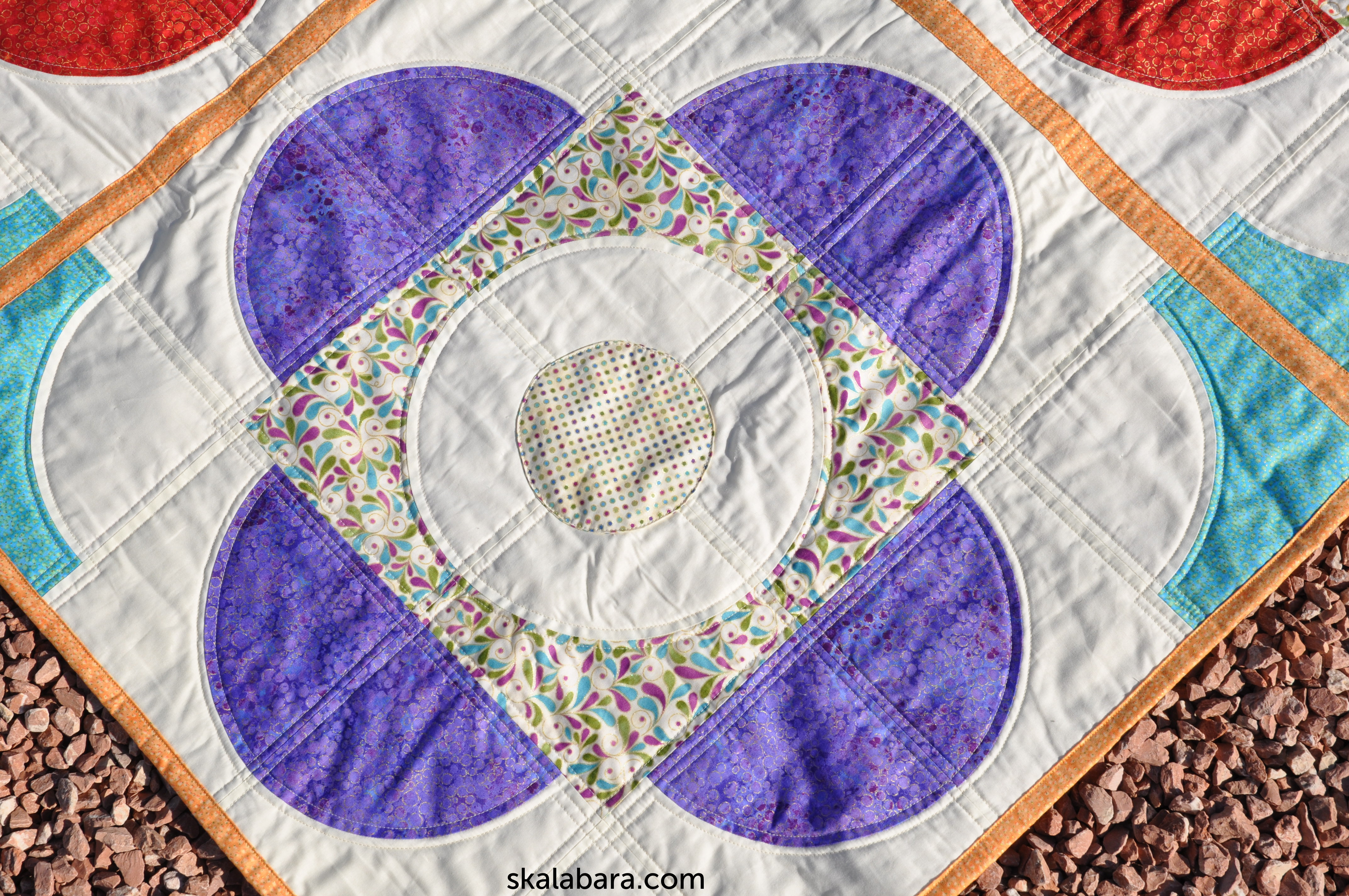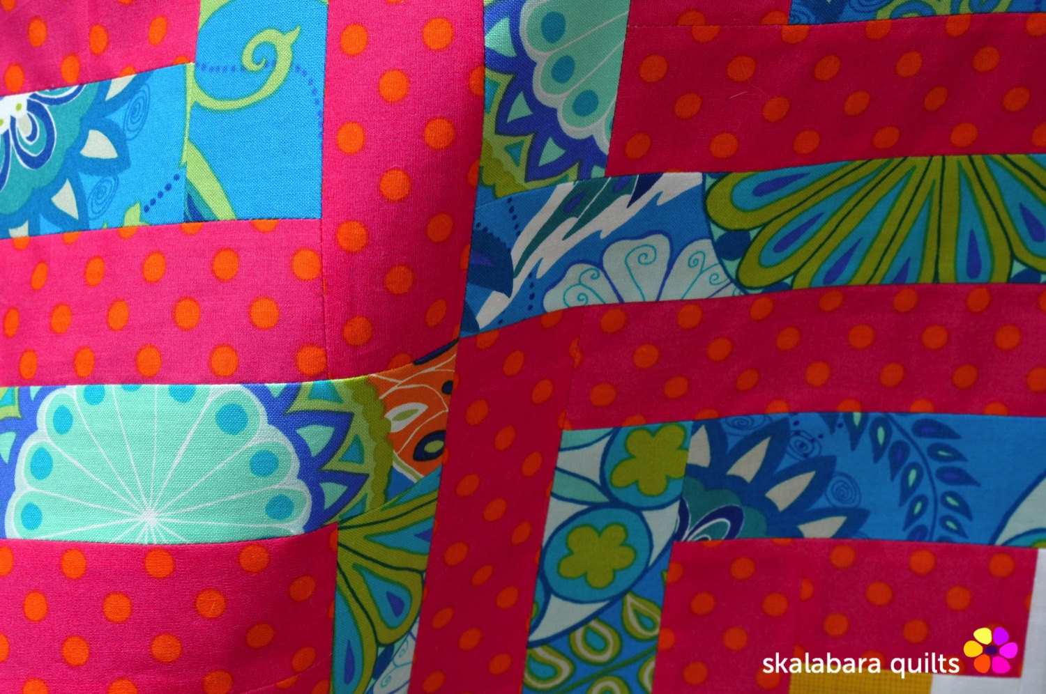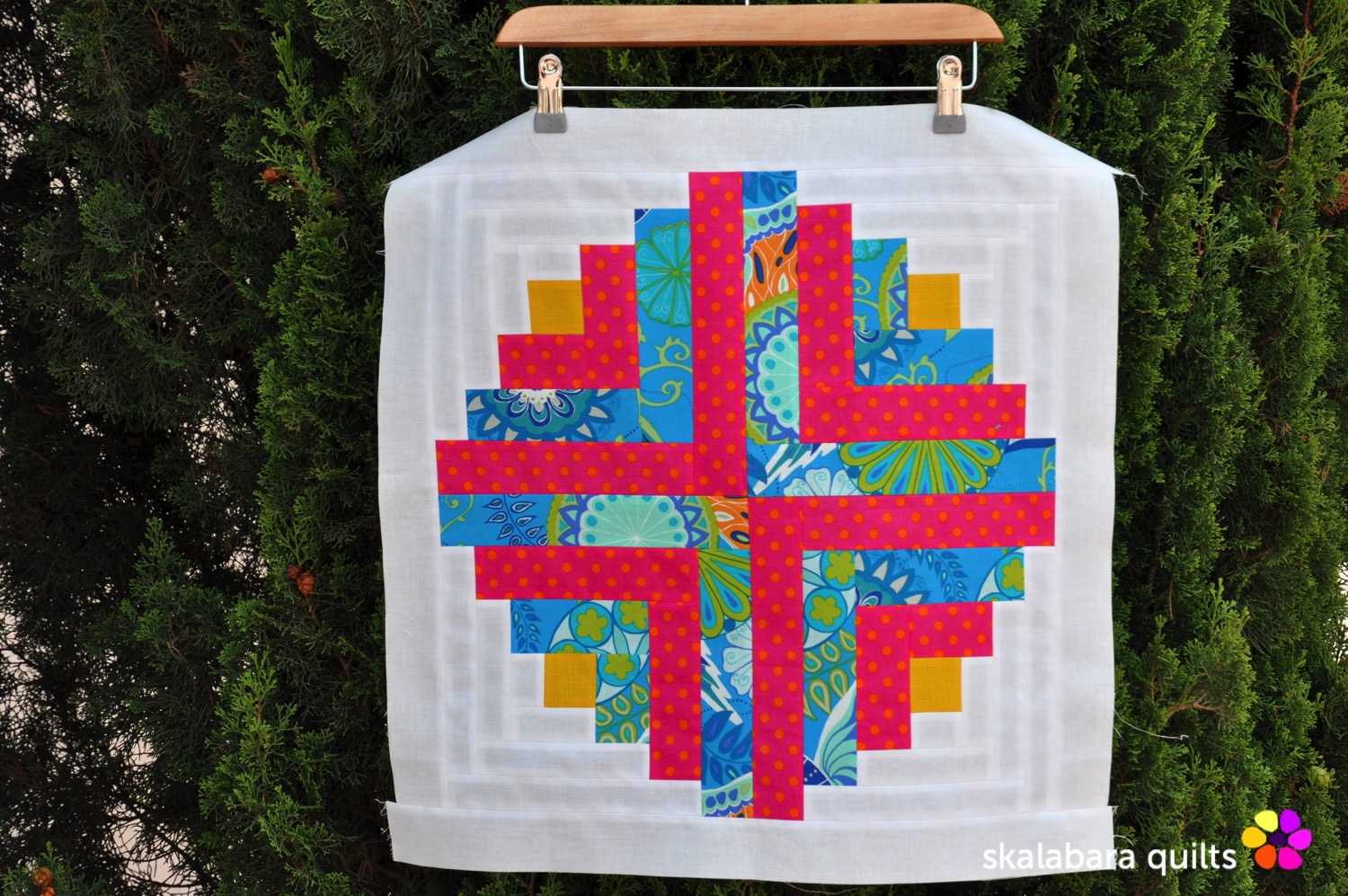 The other day I was on the internet looking what other fellow quilters are up to and I came across a curved log cabin block. Log cabin is always a versatile block with different quilt layout possibilities. But the curved log cabin block makes a nice optical illusion – it looks more like a circle than a square block. I just had to try this new variant of the classical block. What better could I do with the new fabrics I got!