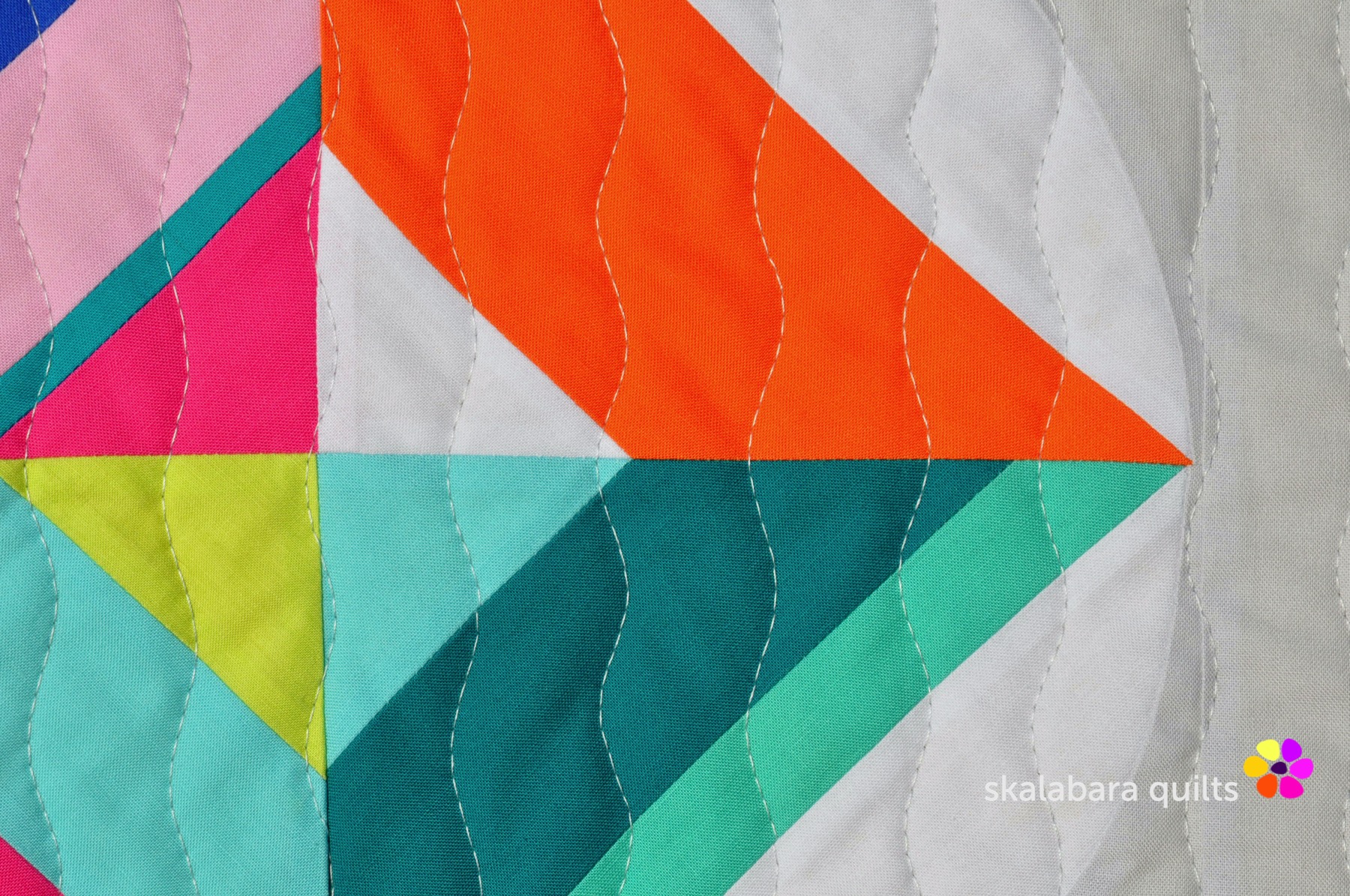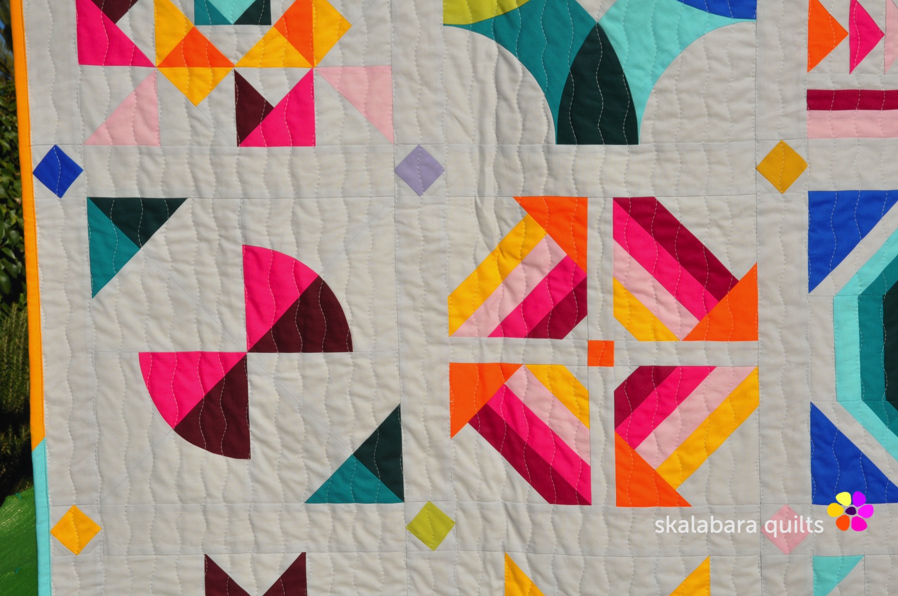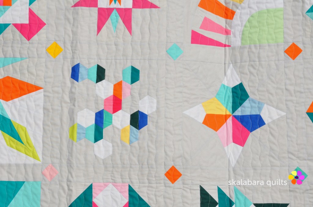 I have quilted the Summer Sampler 2020 with a wavy stich pattern using the walking foot quilting. Quilting thread is from Aurifil – Mako 40/2 – color 2600 Dove.