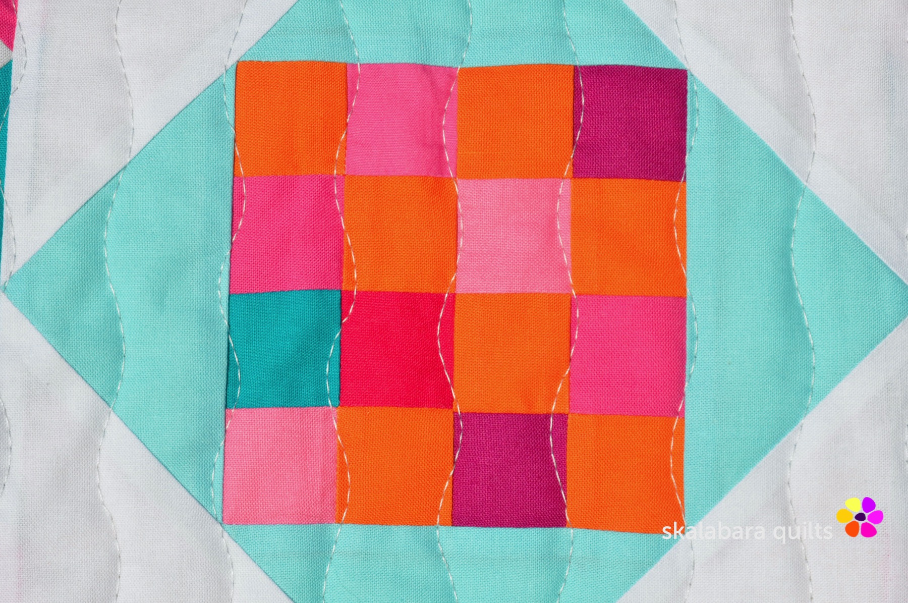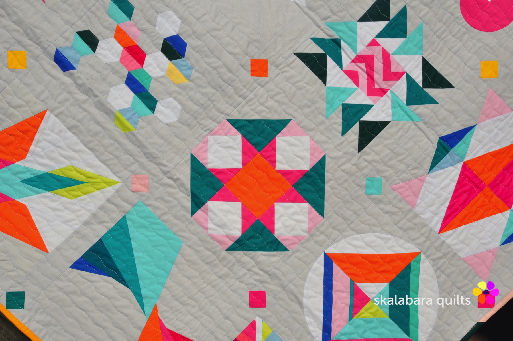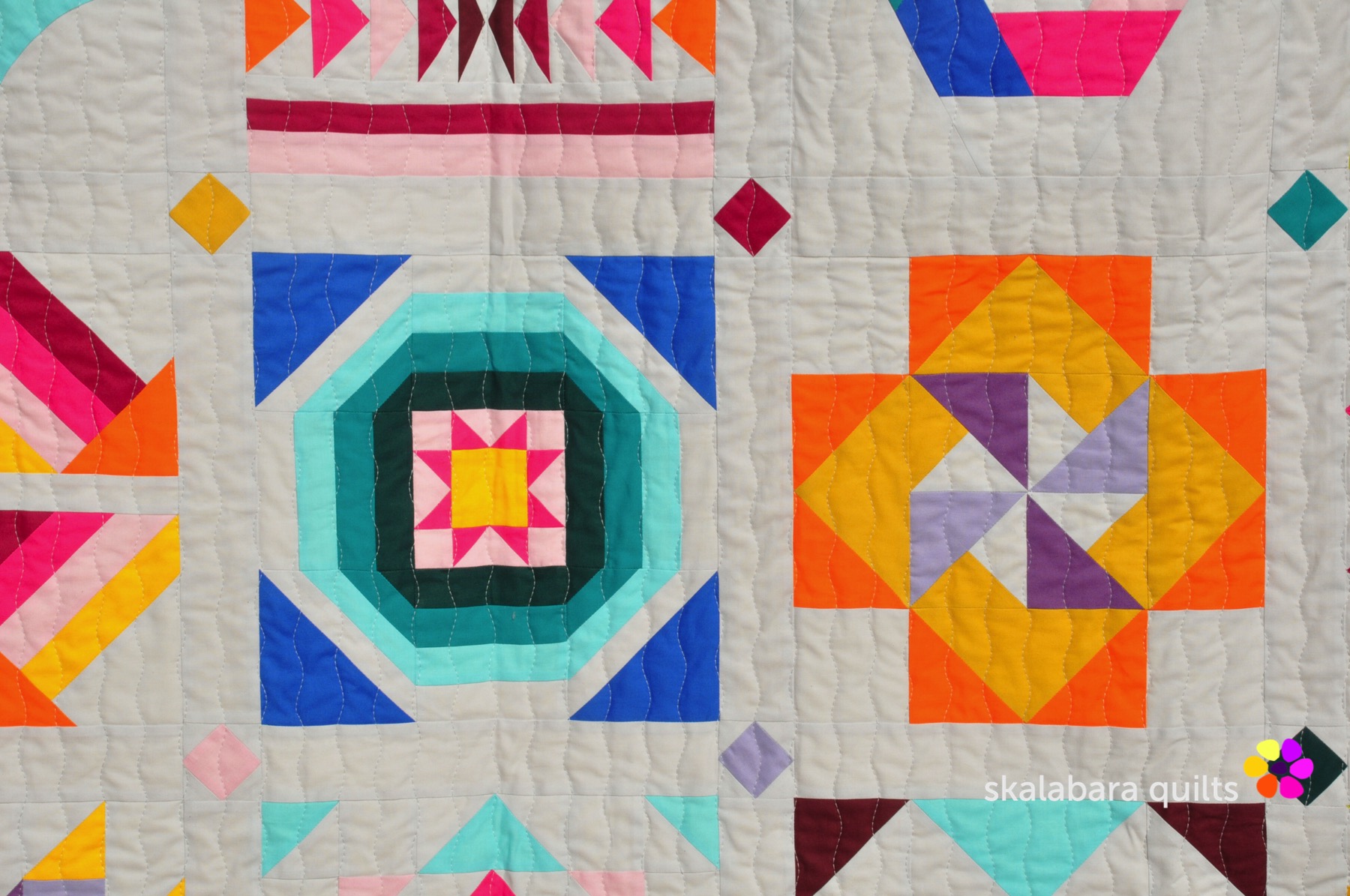 I have quilted the Summer Sampler 2020 with a wavy stich pattern using the walking foot quilting. Quilting thread is from Aurifil – Mako 40/2 – color 2600 Dove.