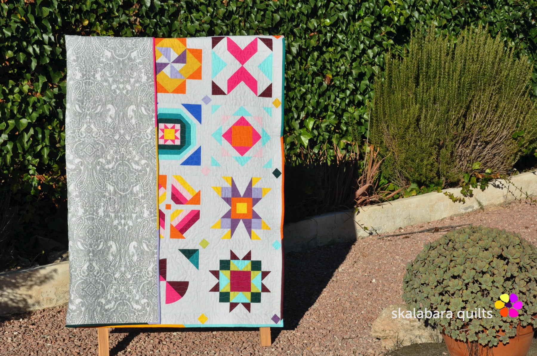 The layout is 4 x 5 blocks with sashing and corner stones. All blocks are 12″ finished and sewn with different patchwork techniques. Like foundation paper piecing, sewing curves or half-square triangles. This time an easy piecing quilt along with some fabulous blocks designs.