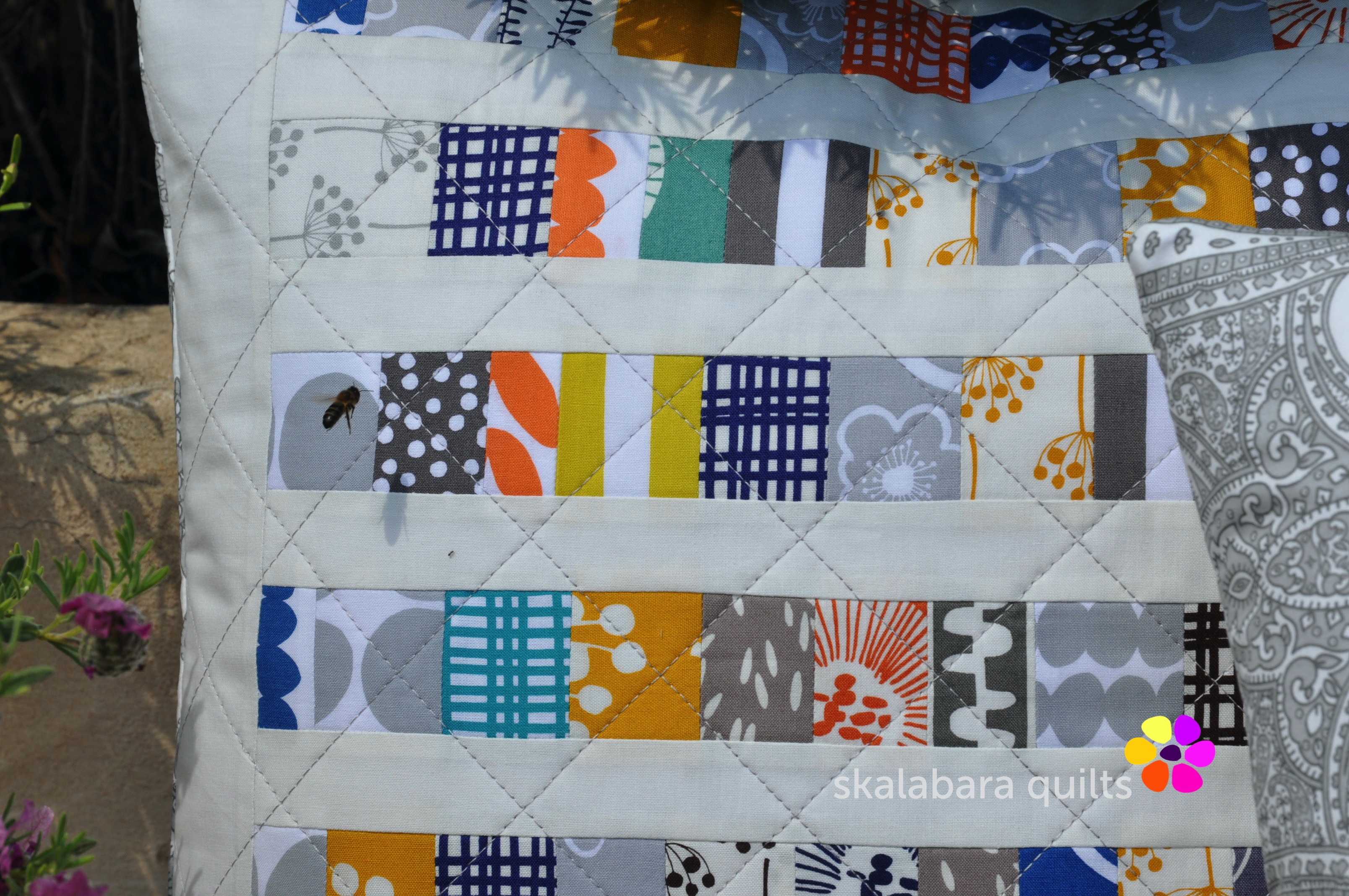 I have used the walking foot to quilt all cushion covers. Followed straight lines on the diagonal, either 1,5″ or 2″ apart. Stitch length is 4 mm. Quilting thread is Mettler Silk Finish in 40 in light grey. Including a busy bee in the photo.
