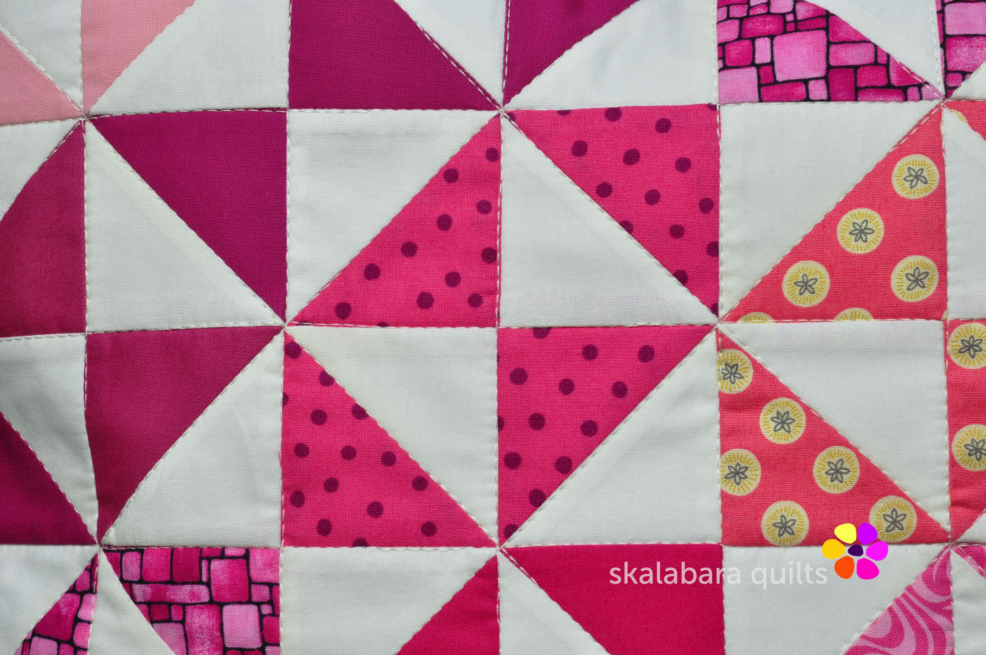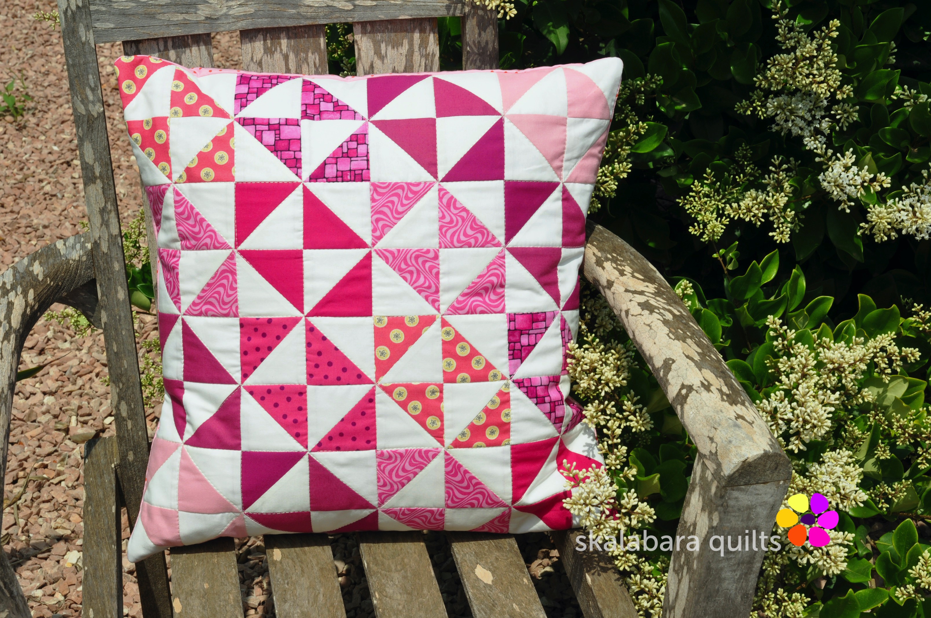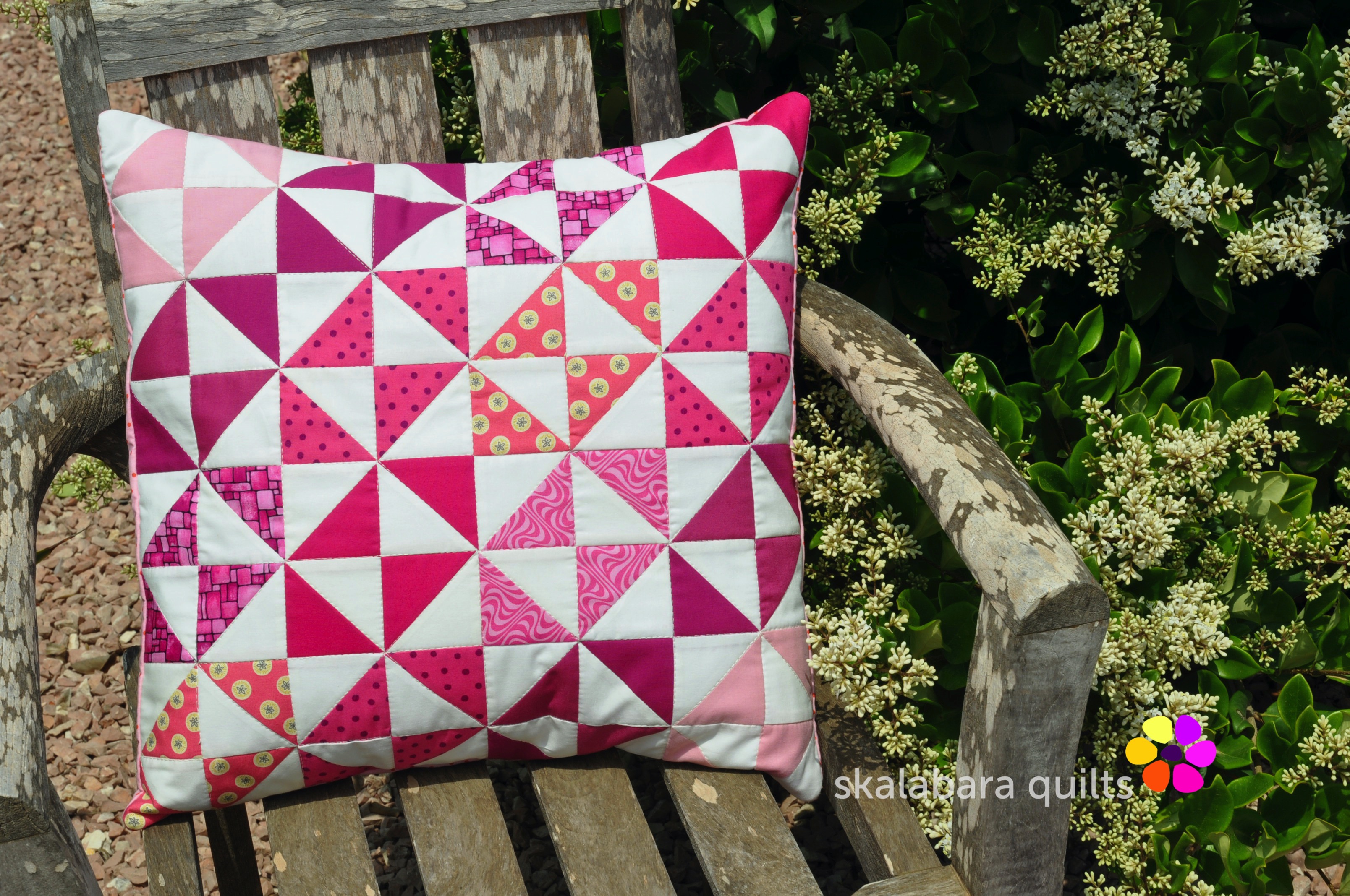 The last cushion cover in this series is a “mixed” pattern. I have pieced the finished blocks and units I had on stock to make a square cushion cover. Somehow a total fantasy design. Finished cushion cover size is : 16” x 16”.