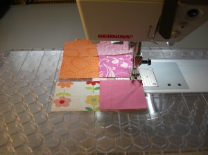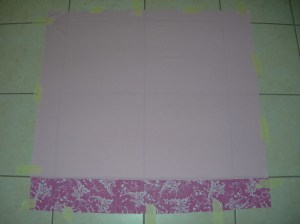 Making a sandwich: place first the backing fabric, wrong side up. Next cotton batting, than heat-resistant batting (check instructions from producer, which side up), finally the decoration fabric.