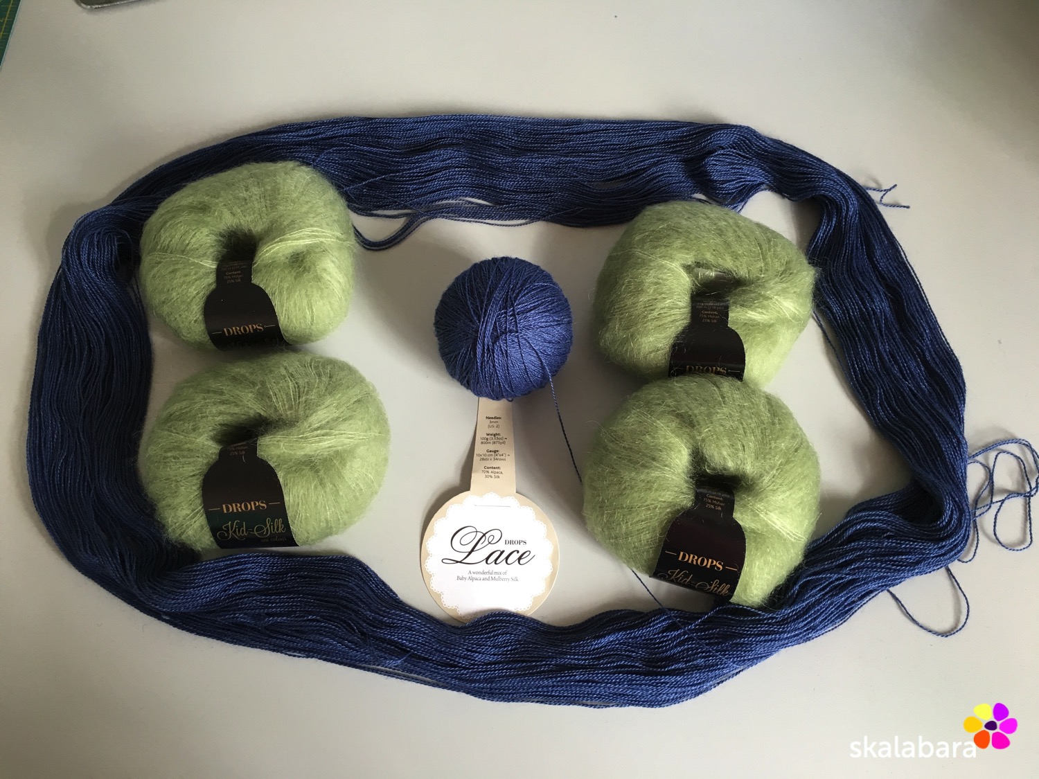 I have chosen jeans blue and apple green to knit the stripes. The Drops Lace yarn is a mixture of 70% baby alpaca and 30% mulberry silk, 100 g = 800 m / 875 yd. The Drops Kid-Silk is a mix of 70% super kid mohair and 30% silk, ball 25 g = 200 m / 218 yd. When I see how thin the yarn is, I shall be still knitting next year!!