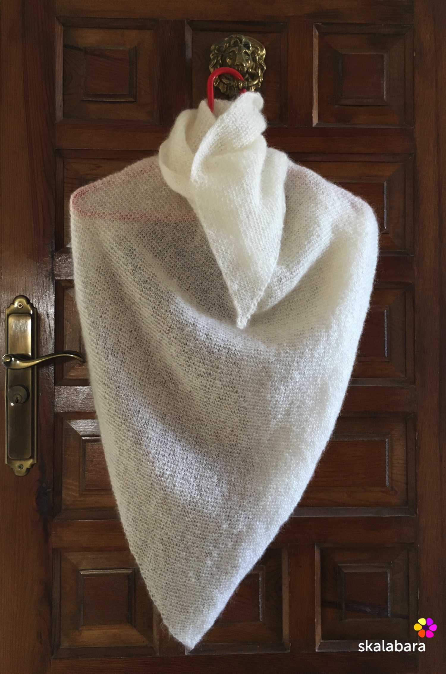 And here photos of the finished white triangle shawl, knitted also with Drops Kid-Silk. It is warm and cosy. As the winter is gone, I hope I can use it in the spring over the shoulders.